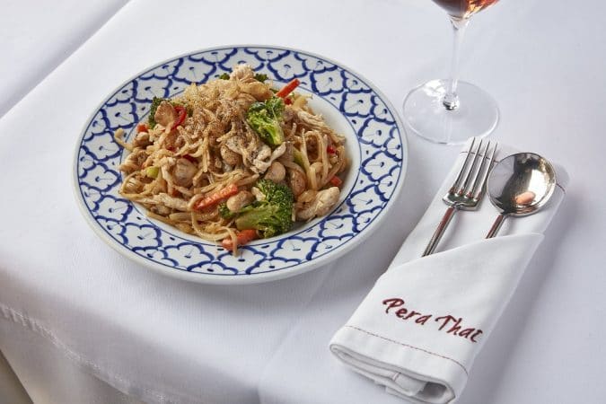 Spicy fried noodles with chicken, sweetbasil and fresh chillies